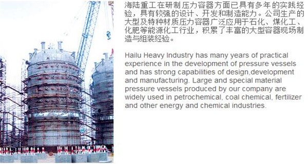 蘇州海陸重工股份有限公司位于江蘇省張家港市開發區,是國內一流的節能環保設備的專業設計制造企業,目前并已初步形成鍋爐產品、大型壓力容器、核電設備、低溫產品、環保工程共同發展的業務格局。公司創建于1956年,注冊資本51640萬元,占地面積近50萬平米。公司下設八個控股子公司,一個余熱鍋爐研究所,在瑞士、北京、武漢、南京、上海、杭州、廣州等地設立分支機構,擁有雄厚的研發實力。公司秉承“科技領航、業界先鋒”的發展理念,注重研究廢熱、余熱利用和環境保護相結合的新技術研發,自主設計能力居同行前列;公司承擔過國家863計劃,江蘇省科技成果轉化專項資金,榮獲國家科技進步二等獎,產品擁有核心自主知識產權并取得專利50多項;公司推行國際先進的管理體系標準和認證,擁有 A級鍋爐制造許可證,A1、A2、A3級壓力容器設計和制造許可證,取得了民用核承壓設備制造資格許可證、美國機械工程師學會(ASME)“S”、“U”鋼印,通過了ISO9001質量體系認證、健康體系認證和14000環境體系認證;公司設備先進,裝備精良,專業嚴謹的制造理念打造出品質非凡、質量一流的“海陸”品牌聲譽。